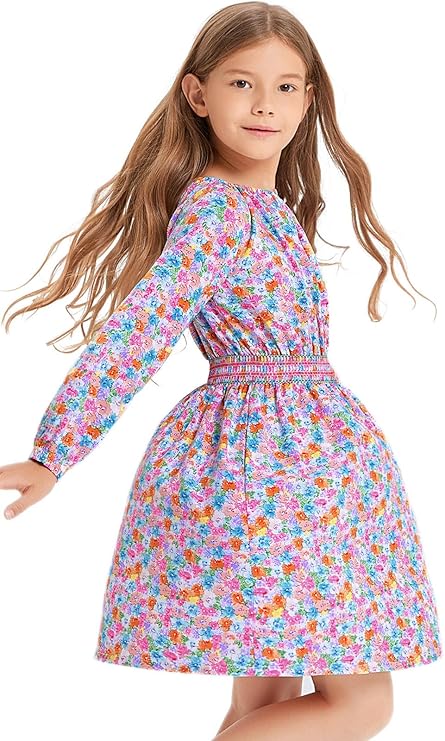 Girls Floral Smocked Waist Dress Church Holiday Playwear Soft Midi Dress with Pockets