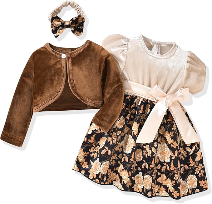 Baby Girls Dress and Velvet Cardigan Sets Infant Girls Casual Floral Print Fall Dresses Winter with Headband